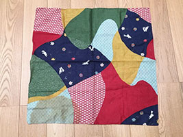 義母は、不要になった着物などを裂いて、さまざまな作品作りを楽しんでいるようですが、今回は、不要になったハンカチを裂いて、40センチほどの敷物を作ることにしました。